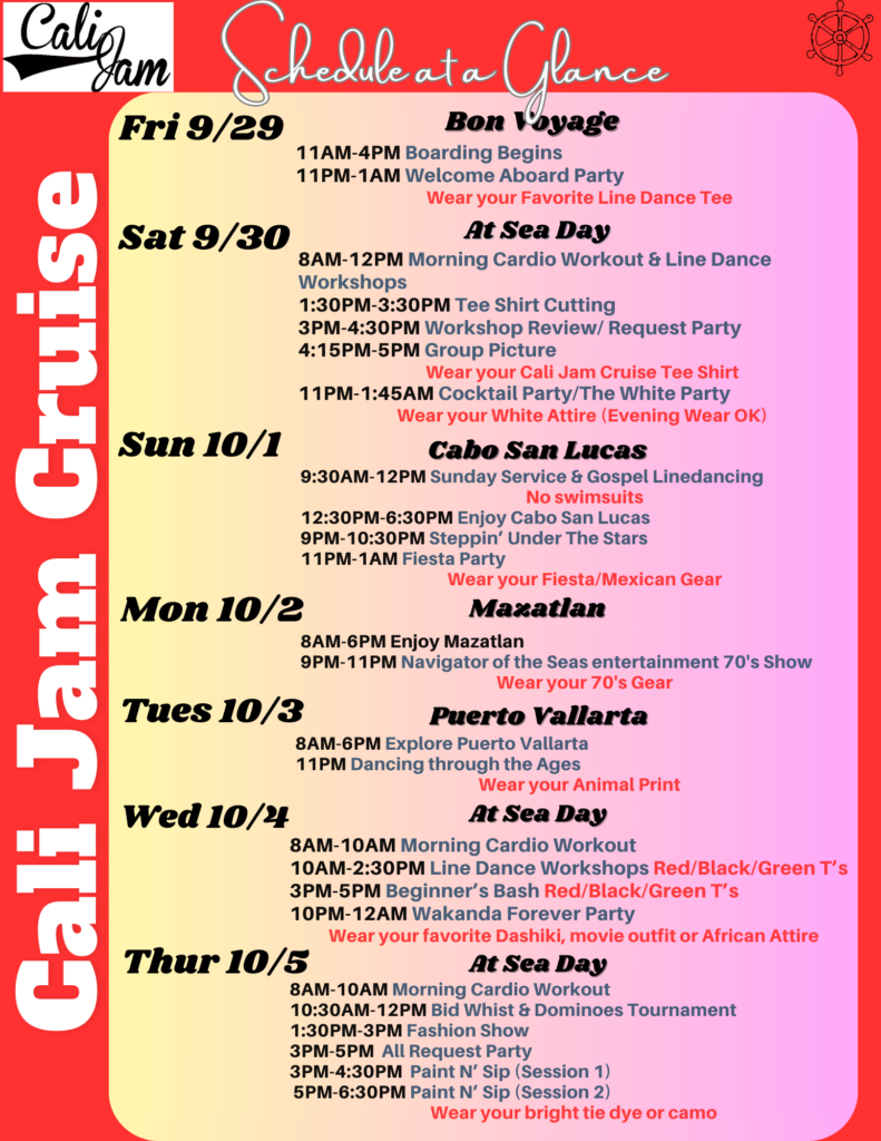Group Picture. Wear your Cali Jam Cruise Tee Shirt. Meet at 4:15 in Theater